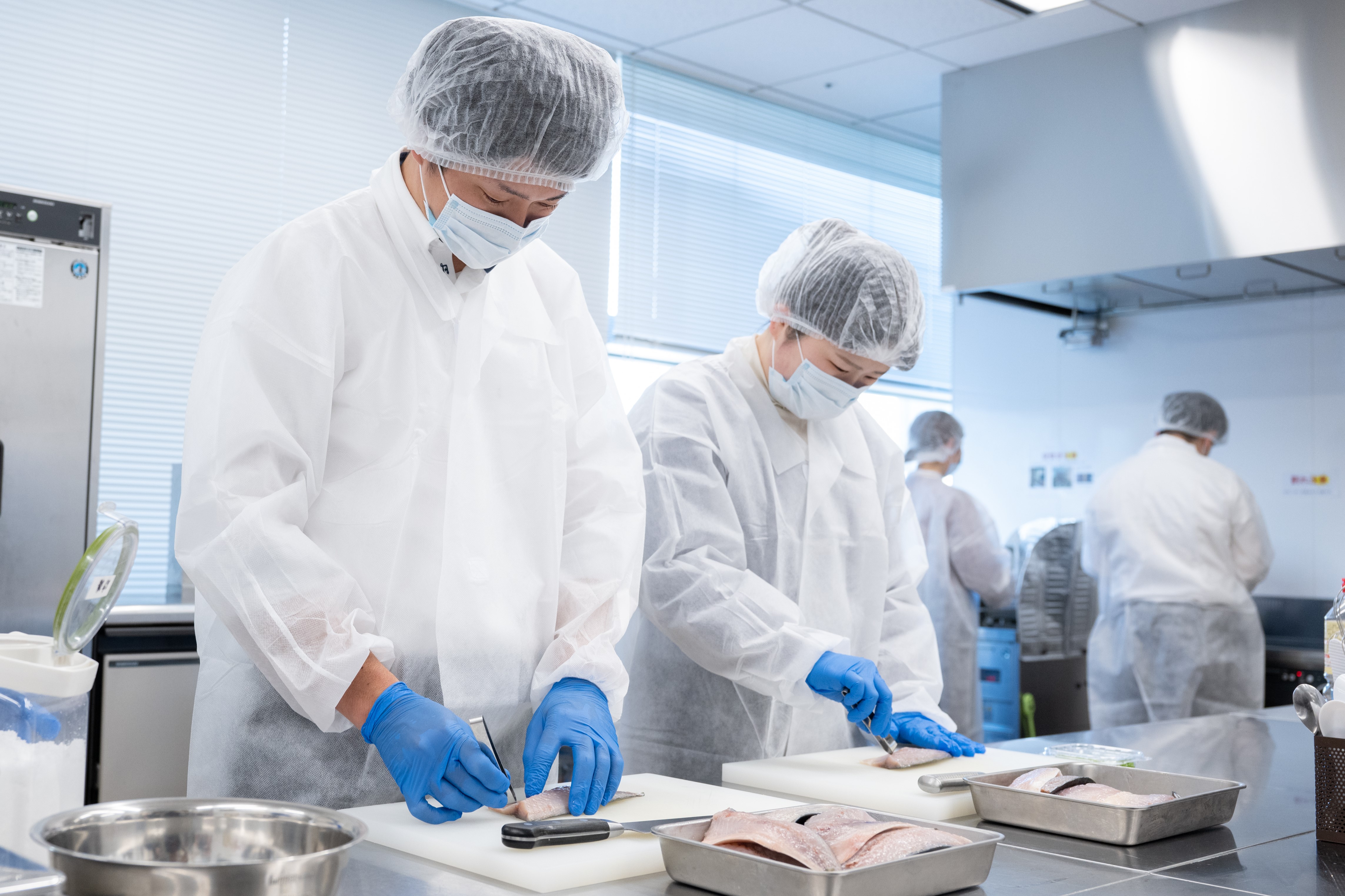 営業部門に寄せられた市場情報や消費者の嗜好等を元にターゲットやコンセプトを特定し、珍味や寿司種等の加工で培ったノウハウと掛け合わせた商品開発を行っています。自社工場の特色ある加工技術を活かしたオリジナルな商品や、 個々のお得意先様の要望にお応えする特別注文商品等、食の楽しさや感動を伝える様々な商品の開発にフレキシブル に取組んでいます。近年では、これまでは原料として使用されていなかった部位(不可食原料)を使用した商品や、プラントベース等の最新技術を活用した商品等、水産資源や環境に配慮した商品開発にも挑戦しています。
