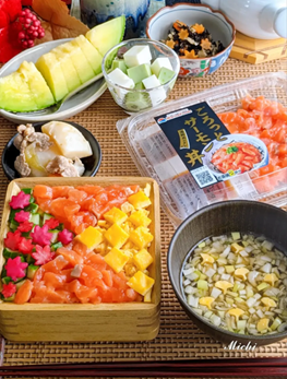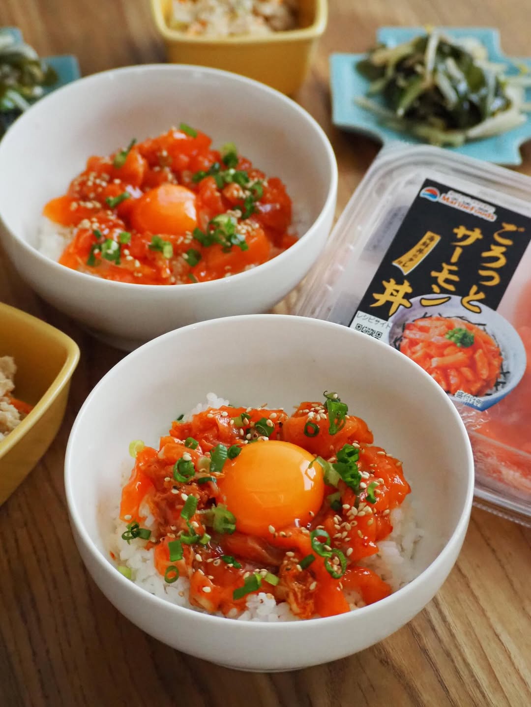 ギンザケをダイスカットし味付しました。添付のタレを使い手軽にサーモン丼ができあがります。お茶碗2杯分で、海鮮丼のタレ2個付き。食事の準備に時間をかけられないときや、火を使いたくない暑い日にぴったりです。