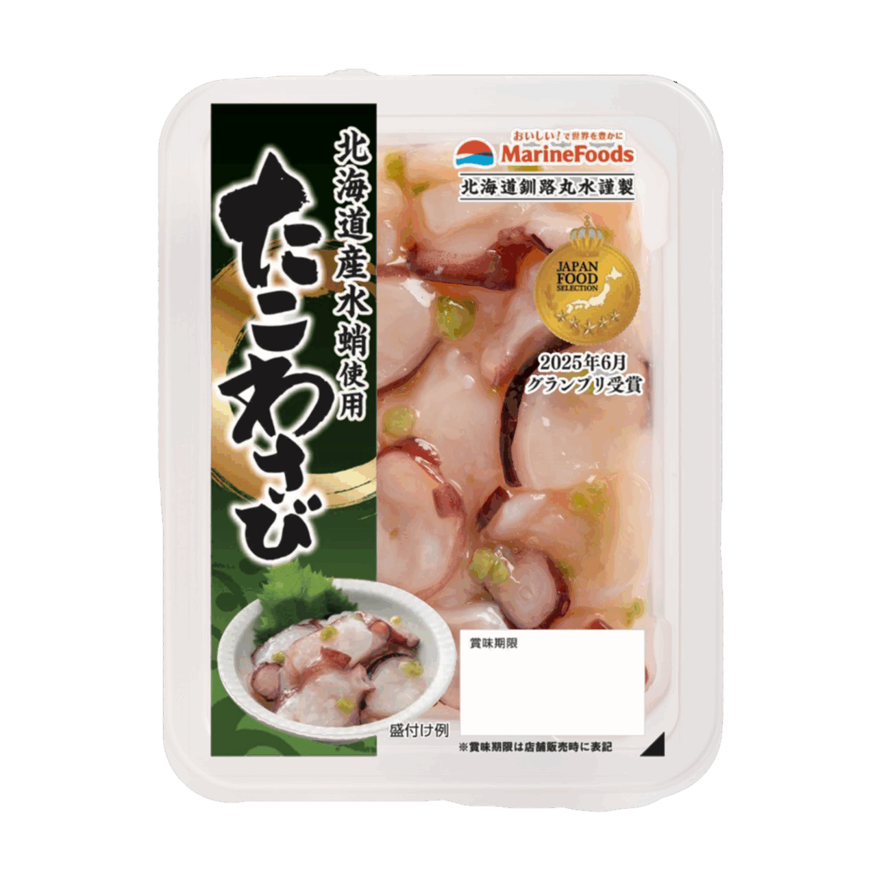 \BS朝日「家呑み華大」で紹介いただきました/ 大きめカットの水蛸と国産のわさび茎を使用し、特製わさびたれで仕上げたお刺身感覚の商品です。