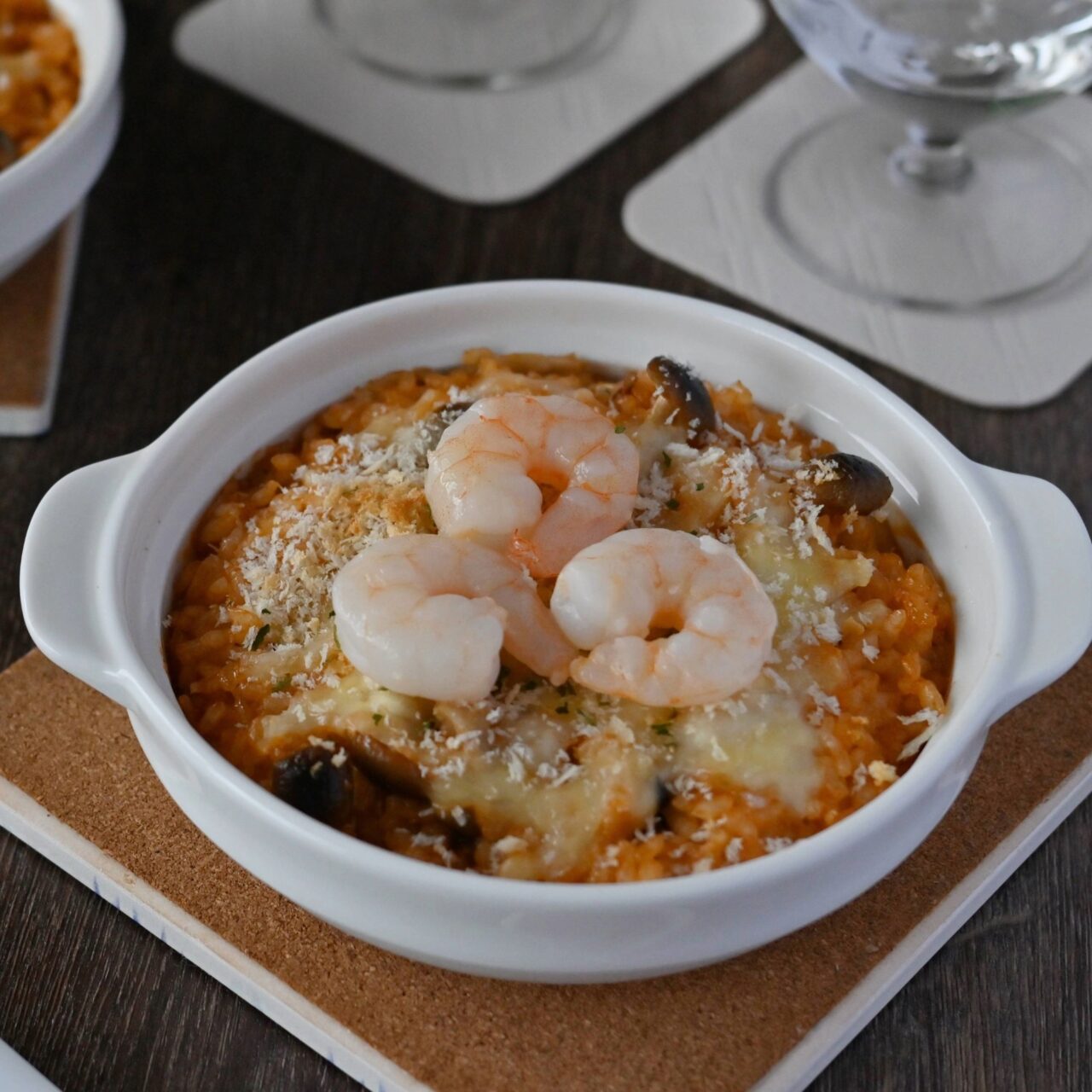 オマール海老の香りを楽しめるスープをごはんに混ぜ込み、仕上げにチーズをのせてこんがり焼き上げたらビストロ風ドリアに変身🍽️