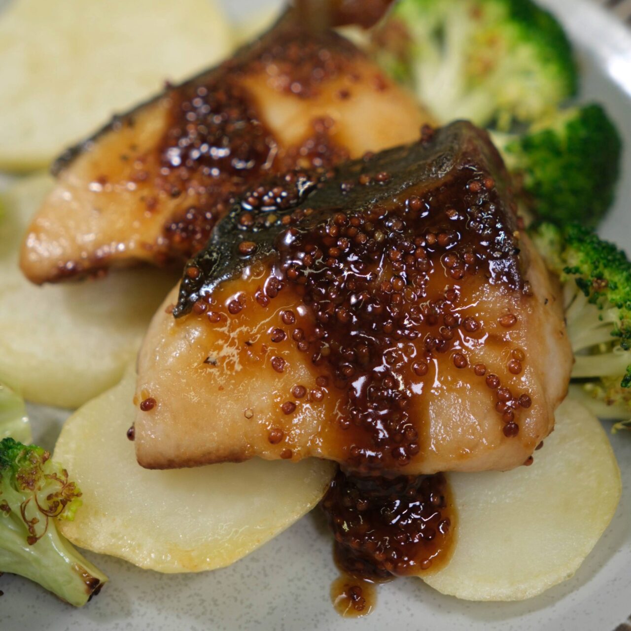 お子さんにも人気✨ 鰤と一緒にじゃがいもを焼いてはちみつとマスタードしょうゆでお子さんも食べられる辛くないソースにからめます😋 いつもの照り焼きをちょっとおしゃれに洋風アレンジしたワンプレートのおかずレシピ😆
