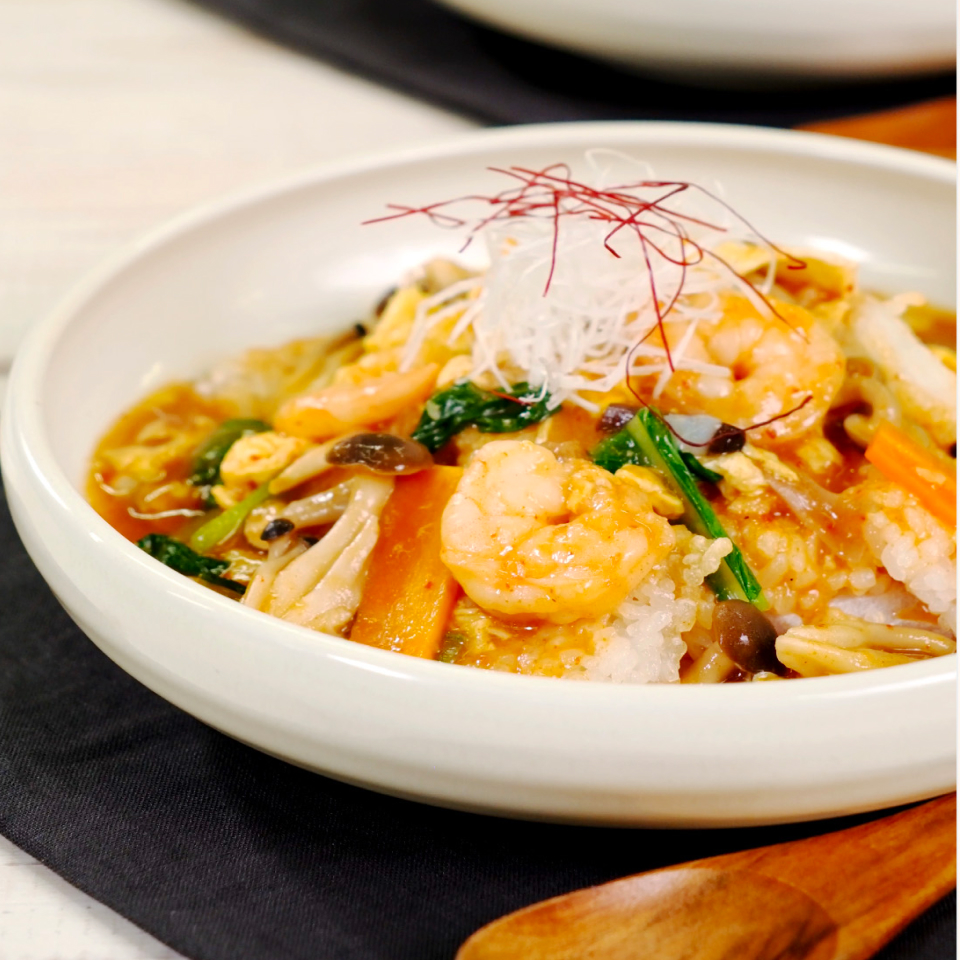 フライパンで”なんちゃっておこげ”を作って、とろみをつけた海鮮ユッケジャン風スープのあんかけでいただきます。ユッケジャンのあんかけには、海老とお野菜をたっぷりと使って!ランチでも夜ご飯でも満足感のあるレシピ。